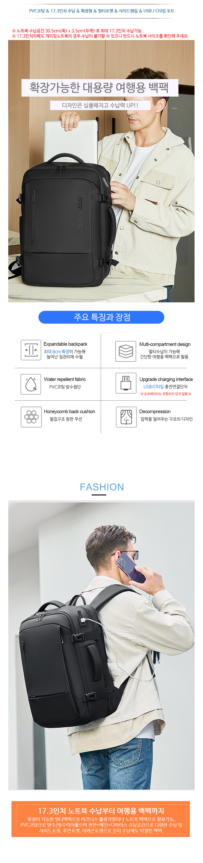 > 17인치 노트북백팩 확장형 여행용백팩 출장가방 (fr24688)